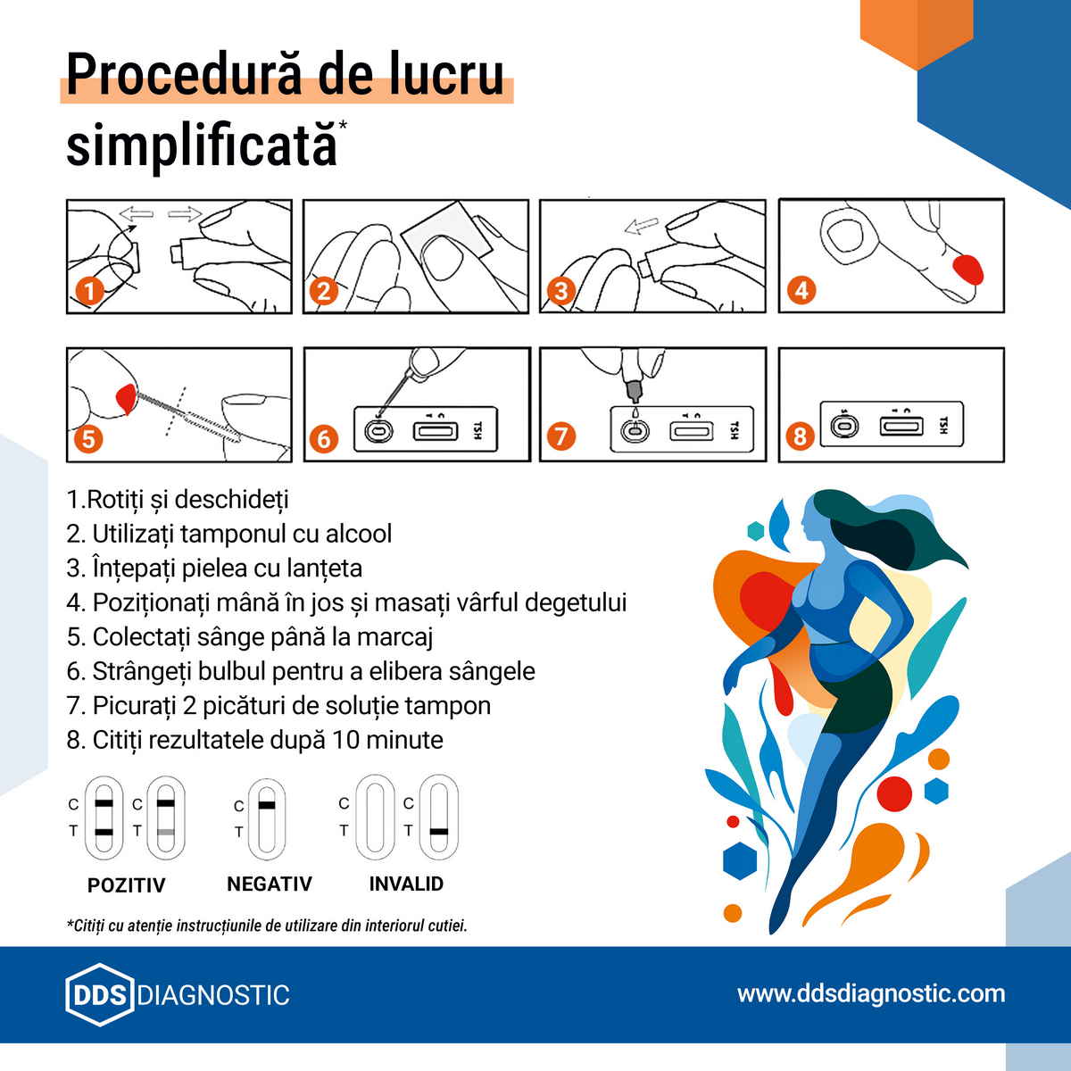 Test rapid pentru identificarea calitativă a hormonului de stimulare tiroidiană (TSH) în probe de sânge integral din deget, contribuind la evaluarea activității tiroidiene și secreției hormonale.