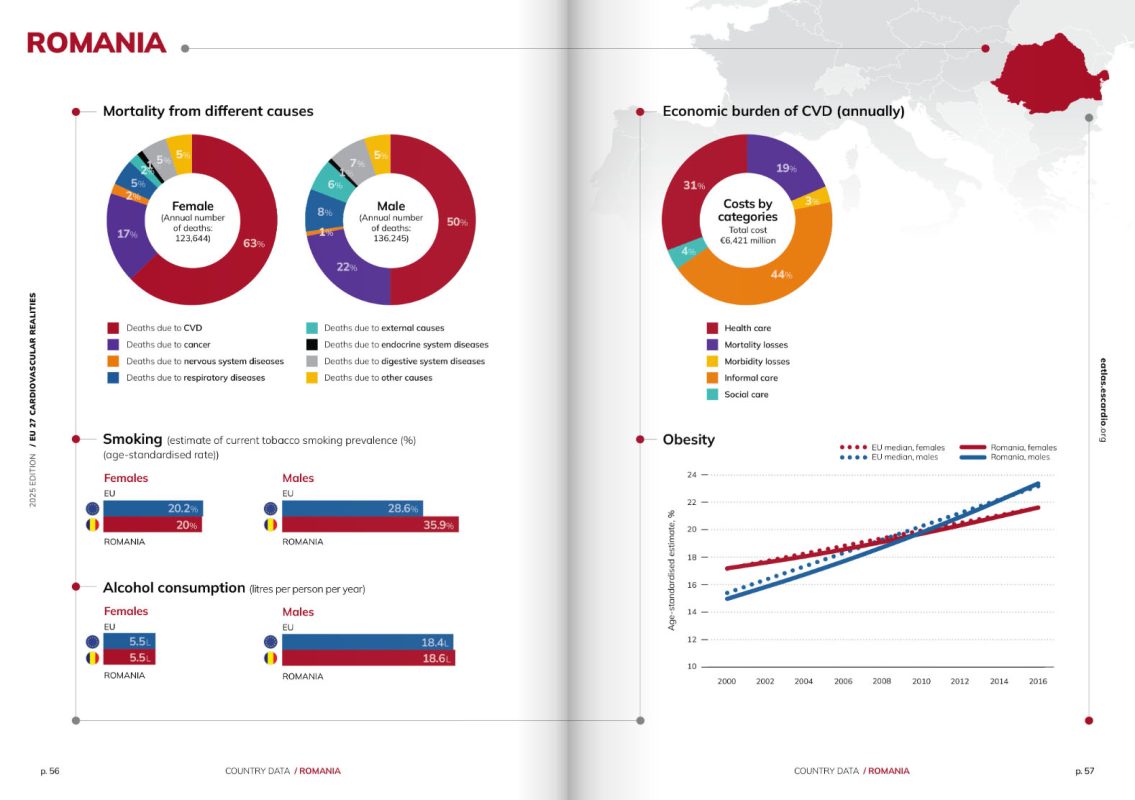 Realitati privind bolile cardiovasculare in anul 2025, in Romania. Pentru referinta, puteti vizualiza raportul integral aici >>> https://www.flipsnack.com/escardio/eu-27-cardiovascular-realities-2025/full-view.html